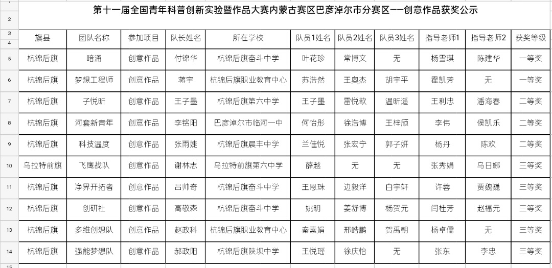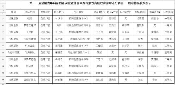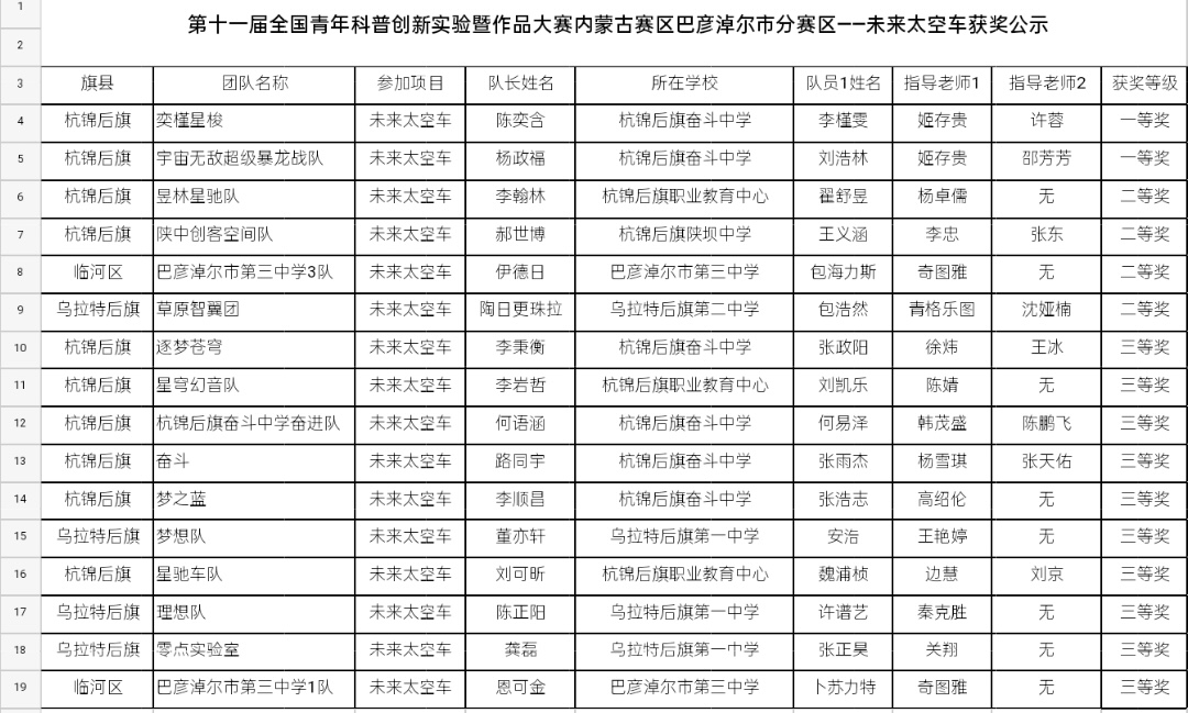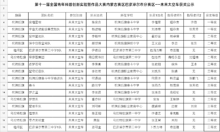 为了动员和激励广大青年学生参与科普创作,扩大科普活动的社会影响力,促进科学思想、科学精神、科学方法和科学知识的传播和普及,按照《中国科协办公厅关于举办第十一届全国青年科普创新实验暨作品大赛的通知》和自治区科协和教育厅制定下发的《第十一届全国青年科普创新实验暨作品大赛内蒙古赛区方案》,在2025年4月19日,由巴彦淖尔市科协和市教育局共同举办的内蒙古赛区巴彦淖尔市分赛场赛事活动中,杭锦后旗科协组织全旗5所中学共35支队伍分别参加了创意作品和科普实验——未来太空车的角逐。经过赛前紧张有序地准备和学生们在赛场上沉着冷静地发挥,最终杭锦后旗代表队以绝对优势位列全市总成绩第一。其中创意作品项目设一等奖队伍2支、二等奖队伍3支、三等奖队伍5支,杭锦后旗代表队获得一等奖2名,二等奖2名,三等奖4名;科普实验项目设一等奖队伍2支、二等奖队伍4支、三等奖队伍10支,杭锦后旗代表队获得一等奖2名,二等奖2名,三等奖6名。